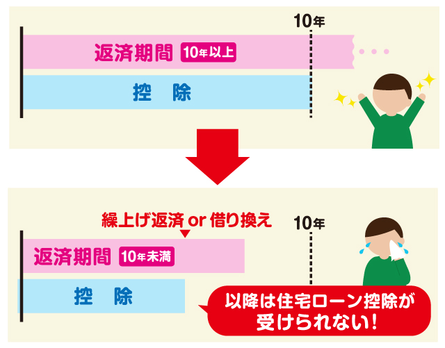 ふたつめは、繰り上げ返済のとき。住宅ローン控除は最大10年間受けることができますが、10年以上の住宅ローンを組んでいることが住宅ローン控除を受けるための要件となっています。頑張って繰り上げ返済をした結果、借入れから完済予定日まで10年を切ってしまうと、その年から住宅ローン控除を利用することができなくなってしまうのです。